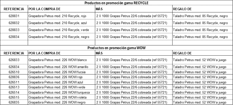 - Productos promocionados: La promoción “Petrus, es para siempre” de Petrus está limitada a un máximo de 3 taladros de regalo por persona/hogar/empresa. El taladro Petrus de regalo será de un taladro Petrus mod. 52 WOW o bien un taladro Petrus mod. 85 RECYCLE en función de la grapadora más grapas que el participante haya adquirido. Ver en Anexo 1 los productos participantes y su regalo asociado.